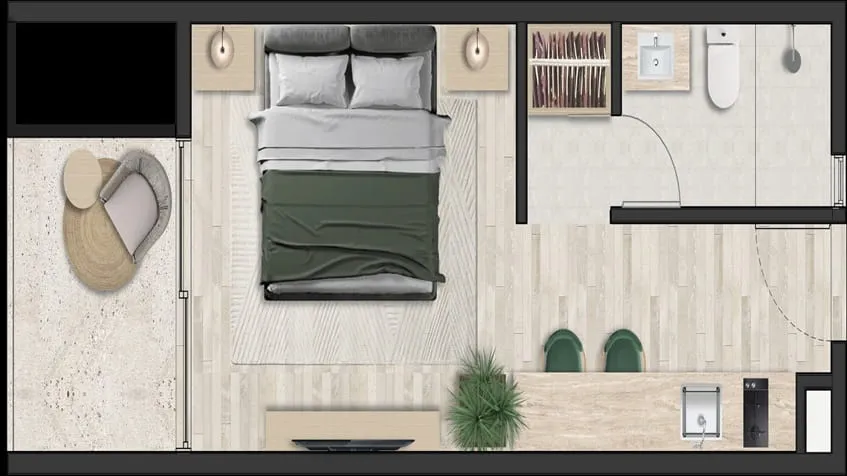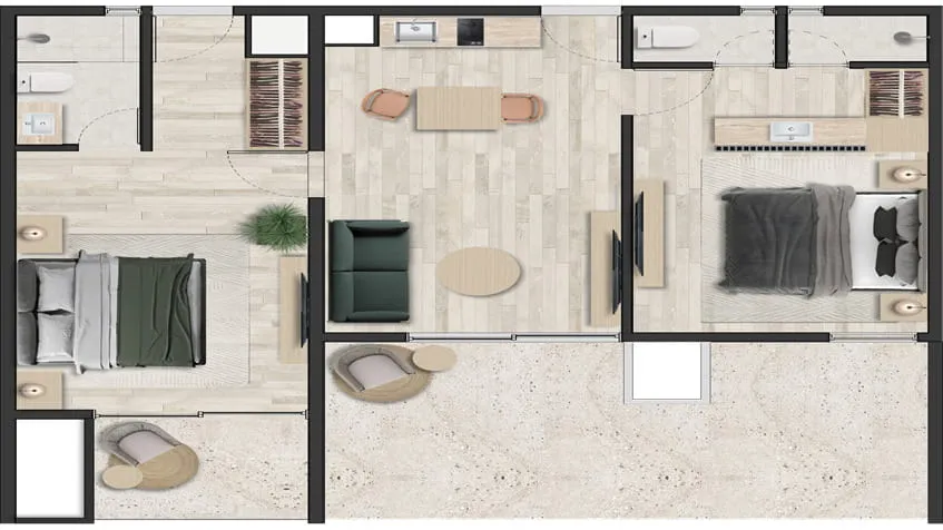 Cada detalle ha sido pensado para brindar una experiencia única. Departamento de lujo con dos recámaras y capacidad para hasta seis personas. Acabados de la más alta calidad y una gran terraza de más de 30mts2 para disfrutar en compañía. Contempla vistas panorámicas a la ciudad y a los jardines, en un ambiente lleno de confort.
