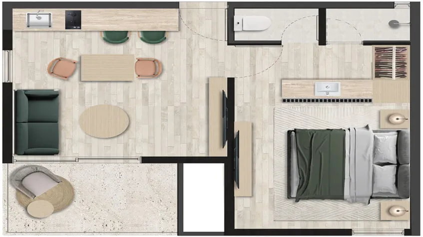 Estudios diseñados para ofrecer un ambiente de lujo y confort. Balcón privado con opción de vistas panorámicas a la ciudad, al jardín y al mar.