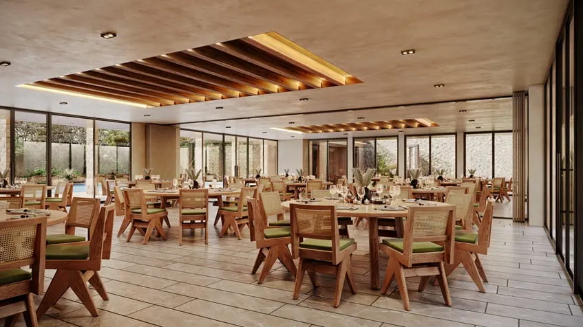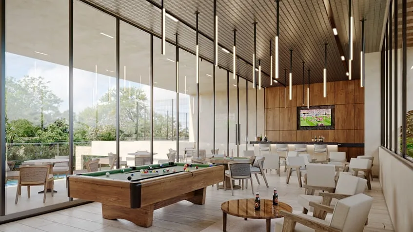 - Espacios Sociales: Salón de eventos modular para celebraciones especiales y áreas de convivencia junto a la piscina.